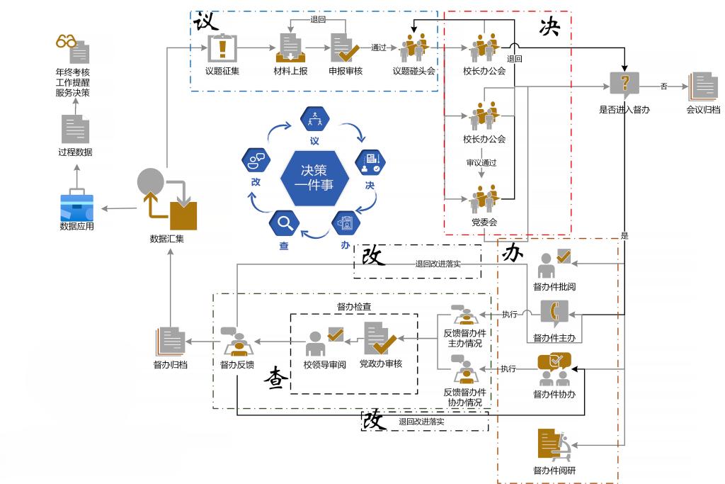 学校“决策一件事”重大应用场景实现了议题征集、材料上报、会议组织、会议纪要、议决事项督办、执行检查、整改反馈的全流程办理,推进了学校现代化治理模式的蝶变,有效推动了事事有落实,事事有反馈,事事有留痕,构建了决策—执行—检查—反馈—改进的闭环机制,取得了五大建设成效:实现了各项决策业务从被动应变到主动求变,从开环模式变成闭环模式,从垂直管理变成扁平管理,从人脑记忆变成机脑提醒,从印象考评变成数据考评。